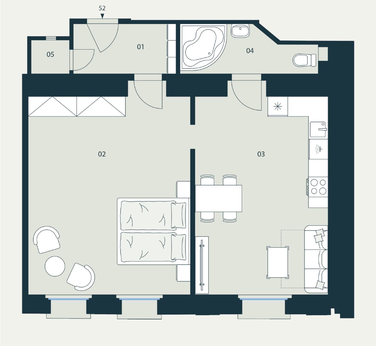 Jednotka o dispozici 2+kk a podlahové ploše 63,8 m² je součástí komorního rezidenčního projektu Rostislavova 4, který právě začíná psát novou kapitolu historie činžovního domu z 30. let 20. století. Projekt vzniká v klidné části Prahy 4 – Nuslí, na pomezí Vršovic, v docházkové vzdálenosti od Náměstí Bratří Synků a s výborným spojením do centra města. Byt se nachází v 5. nadzemním podlaží a jeho dispozice zahrnuje obývací pokoj s přípravou na kuchyň, ložnici, koupelnu s toaletou, komoru a předsíň. K jednotce náleží také sklepní kóje. Nemovitost se prodává v původním stavu před rekonstrukcí, bez finálních povrchů, vybavení či kuchyňské linky, což novému majiteli umožňuje navrhnout si interiér zcela podle vlastních představ a potřeb. Dům prochází kompletní obnovou společných prostor, která zahrnuje opravu historické fasády, novou vstupní halu s bezpečnostními dveřmi, renovaci schodiště s původním zábradlím, nové elektroinstalace ve společných částech i modernizaci technického zázemí. Součástí projektu bude také kolárna, sklepní prostory a odpočinková zóna ve vnitrobloku. Lokalita nabízí veškerou občanskou vybavenost – v okolí se nachází kavárny, pekárny, restaurace i obchody, v blízkosti jsou také oblíbené parky Jezerka, Folimanka nebo Havlíčkovy sady. Tramvajová zastávka Horky je vzdálena jen pár kroků, stanice metra C (Pankrác) i B (Karlovo náměstí) jsou dostupné během několika minut jízdy. Do budoucna bude lokalita ještě atraktivnější díky plánované trase metra D. Tato nabídka představuje ideální příležitost pro vlastní bydlení i investici v dynamicky se rozvíjející části Prahy.