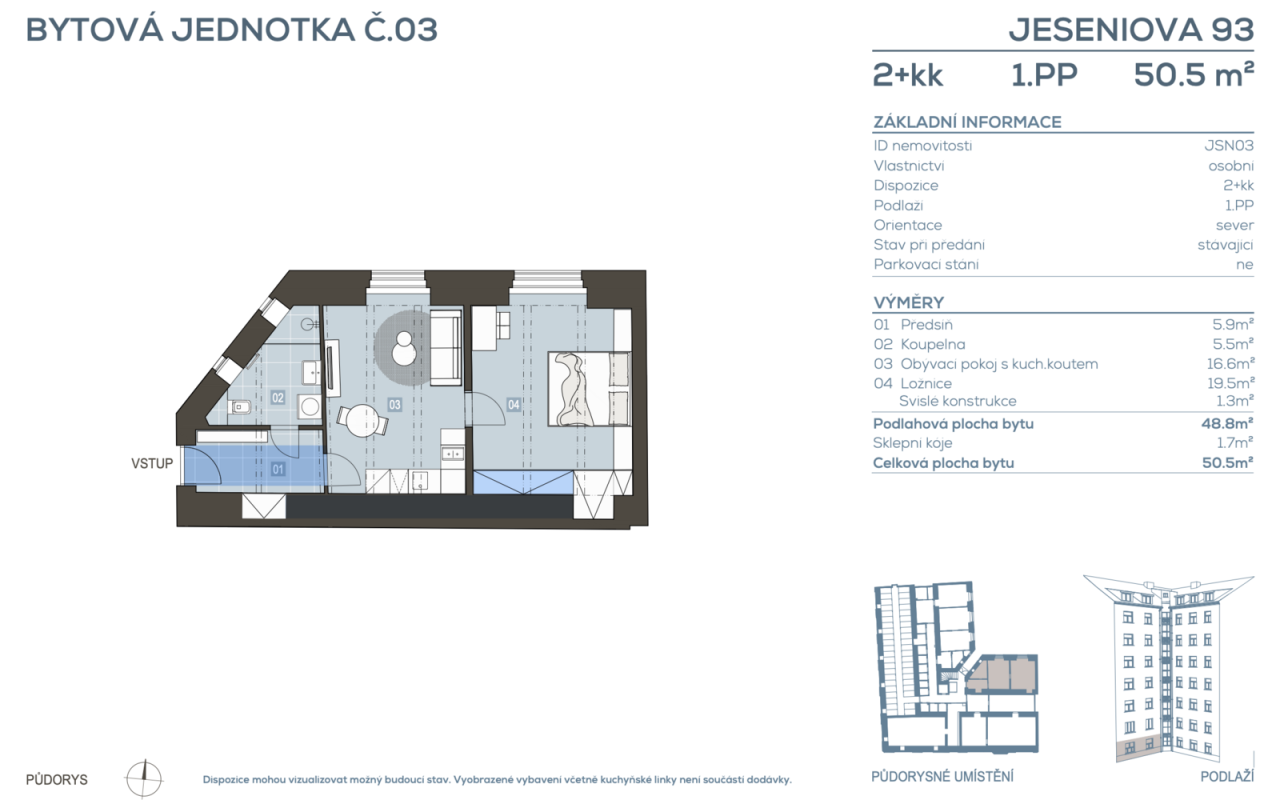 Nabízíme komfortní bytovou jednotku o dispozici 2+kk a podlahové ploše 48,8 m², která je součástí architektonicky působivého projektu Jeseniova 93. Ten citlivě kombinuje eleganci historického domu s prvky moderního komfortu a představuje harmonické bydlení v samém srdci pražského Žižkova – čtvrti plné života, kultury a autentické atmosféry. Byt se nachází v 1. podzemním podlaží a jeho dispozice byla navržena s důrazem na funkčnost a variabilitu prostoru. Součástí jednotky je prostorný obývací pokoj s přípravou na kuchyňský kout, samostatná ložnice, koupelna se sprchovým koutem a toaletou, praktická komora a vstupní chodba s dostatkem místa pro vestavěné skříně. K bytu náleží také sklepní kóje o velikosti 1,7 m². Jednotka je nabízena ve stavu před rekonstrukcí, což poskytuje jedinečnou příležitost dotvořit interiér přesně podle vlastních představ – od volby materiálů až po individuální dispoziční řešení. Samotný dům prošel kompletní a mimořádně zdařilou rekonstrukcí, při níž byl kladen důraz na zachování původního kouzla i kvalitní řemeslné provedení. Reprezentativní společné prostory zaujmou kombinací mramorových obkladů, designového osvětlení z broušeného skla a elegantního proskleného výtahu. Obyvatelům je k dispozici také upravený vnitroblok se zelení, lavičkami a vyvýšenými záhony, ideální pro odpočinek nebo setkávání s přáteli. Lokalita Žižkov patří k nejživějším částem Prahy. V okolí najdete širokou nabídku kaváren, restaurací, galerií i menších obchodů, které vytvářejí osobitou atmosféru této čtvrti. K relaxaci vybízí nedaleký park Vítkov s cyklostezkami, vyhlídkami i místy pro piknik. Na dosah jsou také Parukářka, Židovské pece či sportovní areál Pražačka. Dopravní dostupnost je vynikající – tramvajová zastávka Biskupcova se nachází přímo před domem, zastávka Ohrada je v docházkové vzdálenosti a do centra Prahy se pohodlně dostanete během 15 minut. Byt v projektu Jeseniova 93 představuje ideální kombinaci tradičního městského bydlení, historické elegance a možnosti realizovat svůj vlastní styl.